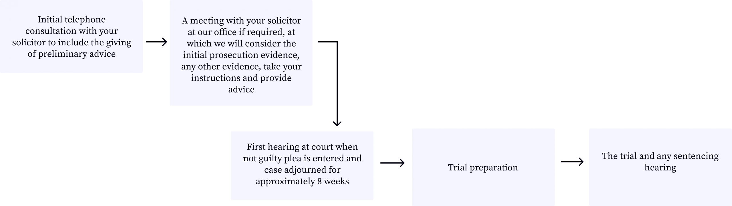 In not guilty plea cases requiring a trial our fees are calculated on an hourly rate basis or, subject to our discretion, a fixed fee may be offered (please call for details). The hourly rate is usually £250 plus VAT plus any disbursements (mileage, expert witness fees etc.) We estimate that a case requiring a half day trial before the Magistrates Court will require, in total 8-10 hours of work.
